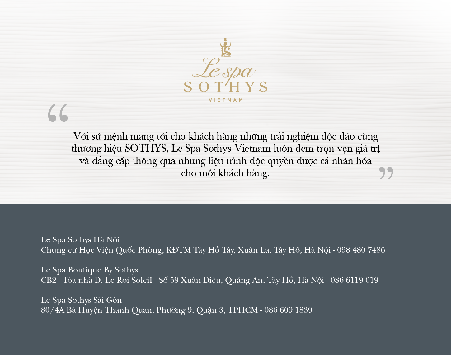 Từ Paris hoa lệ đến New York hiện đại, Sothys Paris - thương hiệu mỹ phẩm chuyên nghiệp đến từ Pháp - đem đến những giá trị tinh túy trong chăm sóc sắc đẹp đẳng cấp Châu Âu ngay tại Hà Nội và Thành phố Hồ Chí Minh với sự ra mắt của Le Spa Sothys. Bước vào vũ trụ của giác quan với không gian sang trọng và riêng tư tách biệt ra khỏi những ồn ào của đô thị, nơi khách hàng sẽ có những trải nghiệm thư thái và hiệu quả với những phương pháp trị liệu cơ thể và làn da chuyên sâu, độc quyền của Sothys.